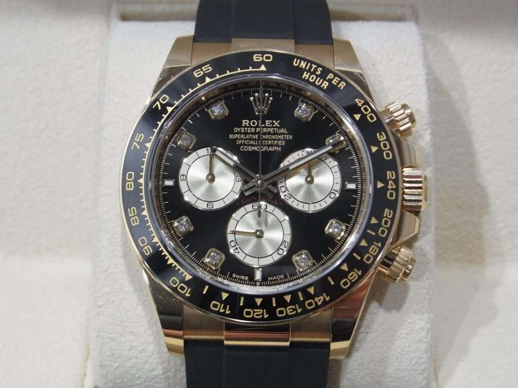 今回買取させて頂いた126518LNGは、文字盤がサンレイ仕上げで主色がブラック、目玉がゴールドのブライトブラック&ゴールデン文字盤で、ダイヤモンドもセッティングされているため126518LNよりもゴージャスなお品でした。
