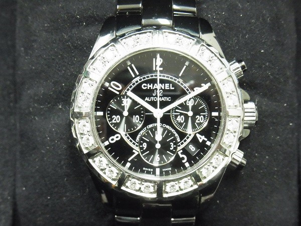 今回買取させて頂いたJ12クロノ(品番H1178)は、ケース径41mm、ブラックセラミック仕様のケース&ブレスレット、自動巻きムーブ搭載、そして、ベゼルに24石のダイヤモンドがセットされたモデルです。