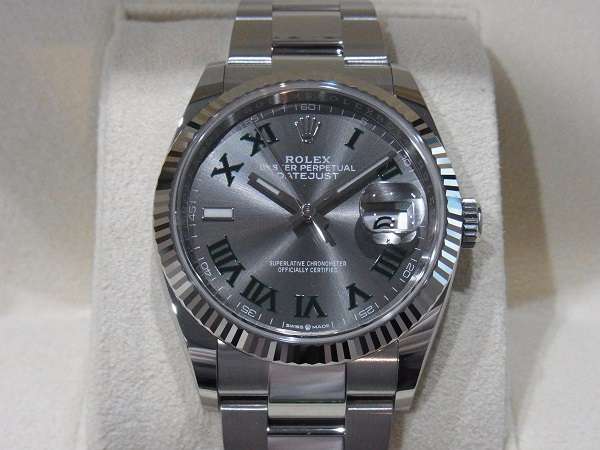 今回買取させて頂いた126234は、ウィンブルドンダイアルとも呼ばれる「スレートローマンダイアル」に、3連リンクの「オイスターブレスレット」が合わさった、2021年新作モデルです。