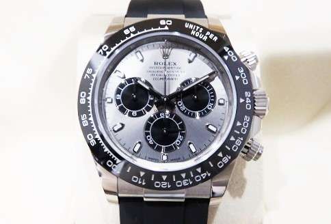 Ref.116519LNは、18Kホワイトゴールドケースに、ブラックセラミックベゼル、オイスターフレックスブレスレット(ラバーベルト)が組み合わさった、2017年新作のデイトナです。