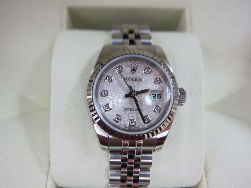今回買取させて頂いた179174Gは、ジュビリーモチーフ、彫りコンピューター、ホリコン、などと呼ばれる、ROLEXの文字がコンピューターグラフィックで模様に見えるようにデザインされた、数ある10Pダイヤモンド入り文字盤の中でも特に人気の高い、ダイヤモンド入りホリコンピューター文字盤が合わさった個体です。