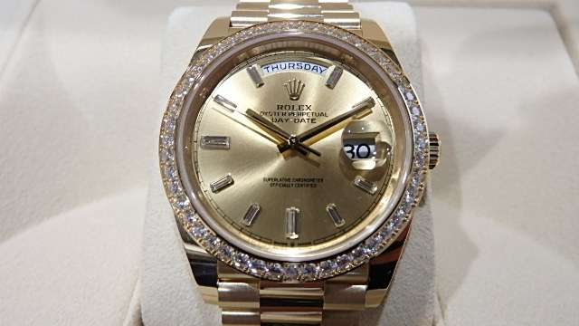 イエローゴールドにシャンパン文字盤の組み合わせだけでもかなりゴージャスなデイデイト40なのですが、ダイヤモンドベゼルにバゲットポイントダイヤモンドがセッティングされさらにゴージャスなモデルに・・・・