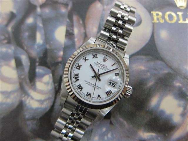 お持ち込みいただいたブランド時計は【ロレックス 79174 デイトジャストレディース ホワイトローマン F番】