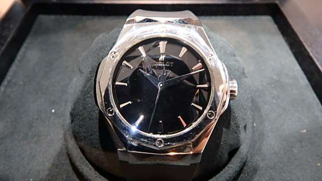 今回買取させて頂いたRef.550.NS.1800.RX.ORL19は、アーティスト自身が希望したというウブロとしては少し小ぶりな40mmケースに、12角形のベゼル、ファセット構造のブラックダイアルが合わさった、チタニウム×ラバー素材の、2019年新作モデルです。