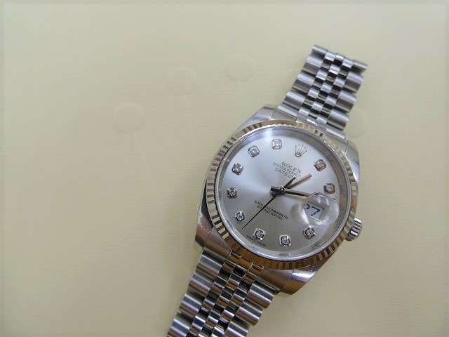 今回買取させて頂いた116234Gは、10Pダイヤモンド入りシルバー文字盤が合わさったモデルです。10年くらい前だとスポーツモデルライクなブラック文字盤の需要が高かったですが、近年はエレガントなモデルの需要が高まっており、こういったケース・ダイアル・ブレスが同色で統一された一体感のあるデザインが注目を集めています。