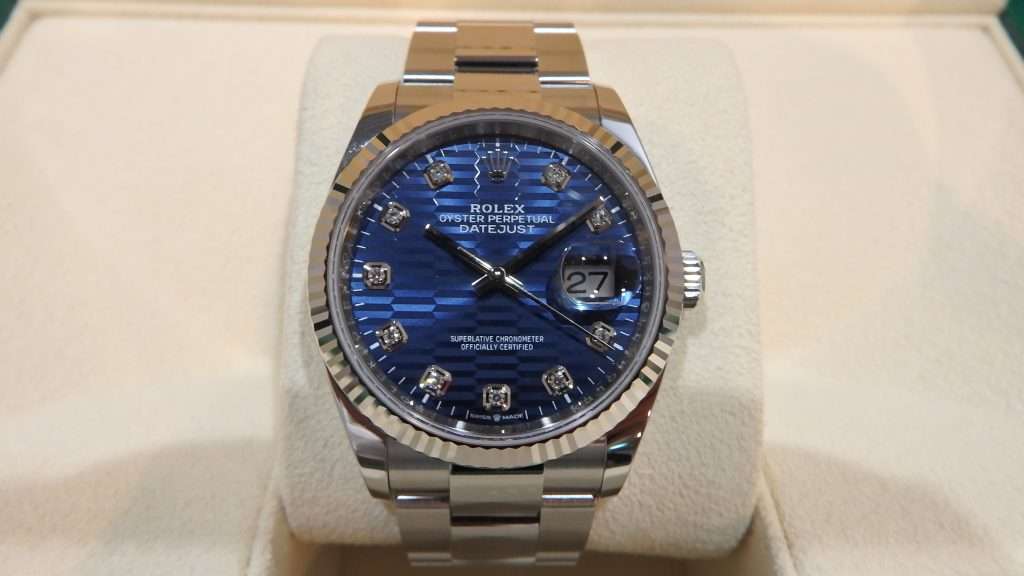ちなみにスムースベゼルの126200や、41mmの126334や126300にもダイヤなしのブルーフルーテッドモチーフ文字盤はありますが、10Pダイヤありのブルーフルーテッドモチーフ文字盤はこちらの126234か、ベゼルダイヤ仕様の126284RBRでしか選ぶことができません。