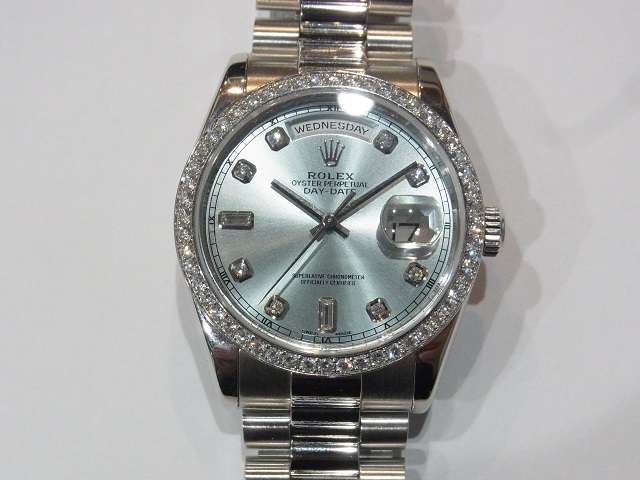 今回買取させて頂いたRef.118346Aは、プラチナモデル専用色のアイスブルー文字盤にダイヤインデックスという華やかなモデルです。加えて、ベゼルにもダイヤモンドがあしらわれており、圧倒的な存在感を醸し出しています。