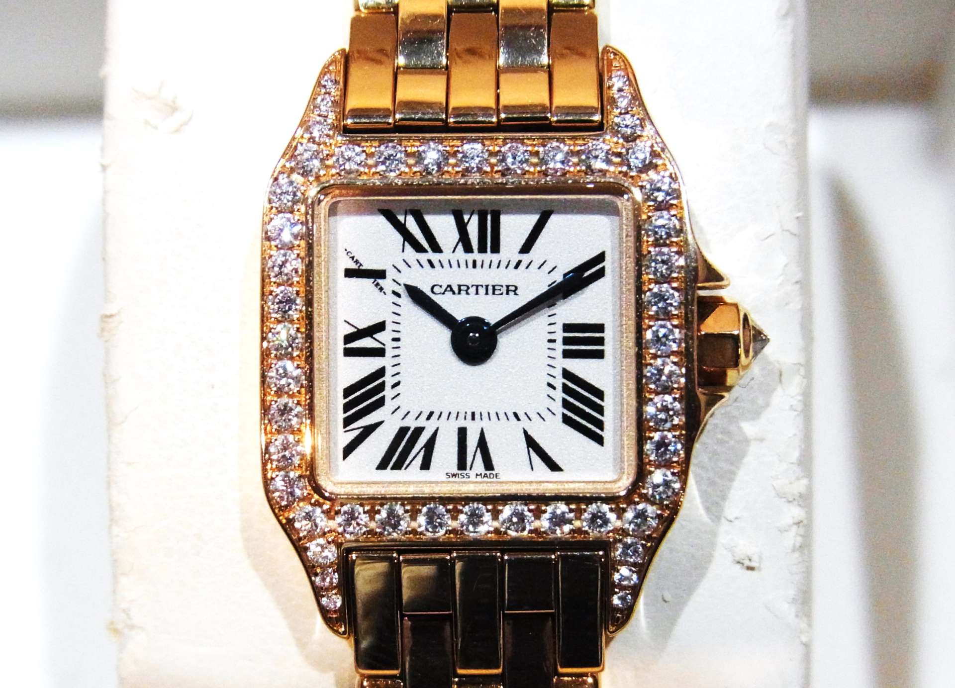 買取させて頂きましたカルティエミニサントスドゥモワゼルWF9011Z8は、新しく時計を買い替えるとの事でご来店くださいました。