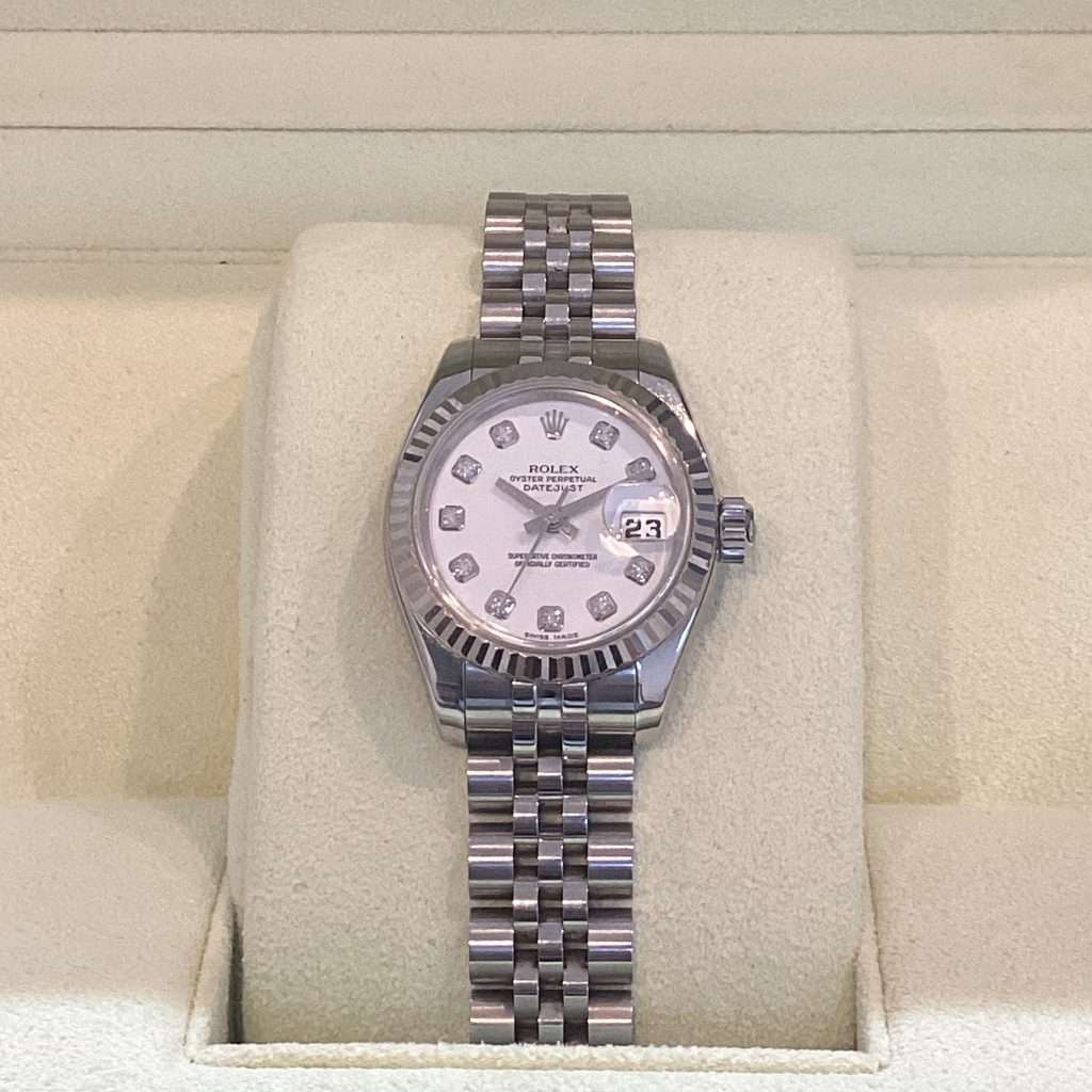 今回買取させて頂いた179174Gは、文字盤が8角形の台座にダイヤモンドがセッティングされている白文字盤で、当時はピンク文字盤と購入を迷われていた中どんなシーンにも合わせやすい白文字盤にされたそうです。
